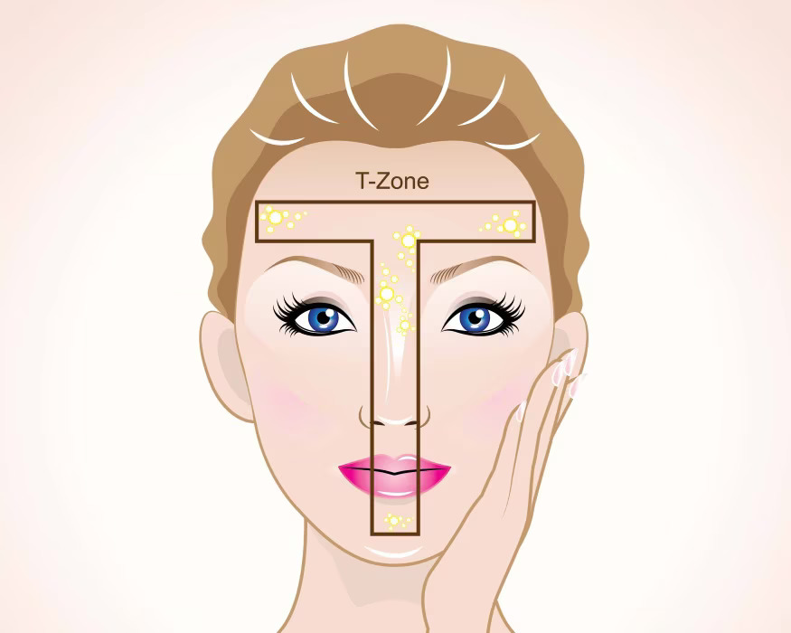 Zona „T” a feţei (frunte, nas, bărbie) este frecvent implicată, deoarece aici există o densitate mai mare de glande sebacee.